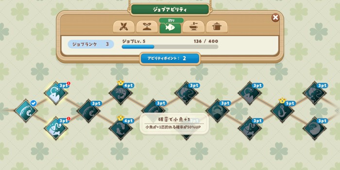 分岐する王冠アビリティもレア魚を釣り上げるために「チャンス時の引っ張り性能UP」を上げると良いです。