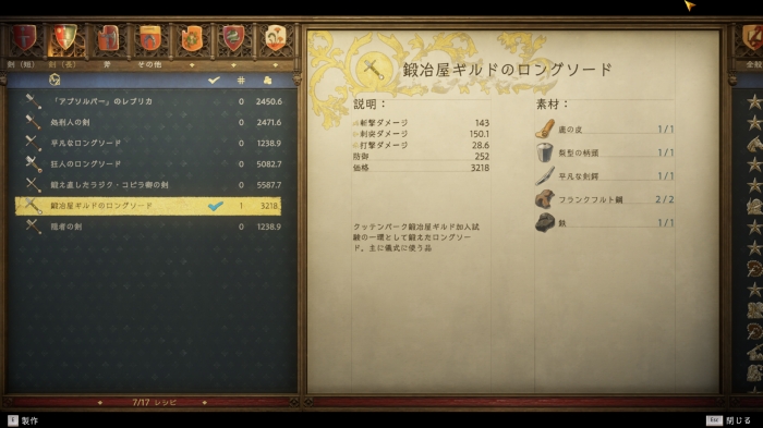 ブシェクから「鍛冶屋ギルドのロングソード」の設計図がもらえるので、そばにある鍛冶場で鍛冶屋ギルドのロングソードを作成しよう。品質は「金」でクリアできた(銀以下でクリアできるかは不明)。