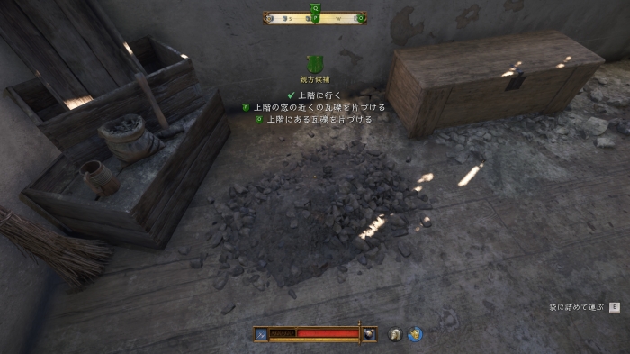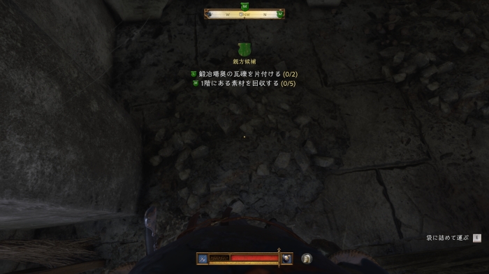 自室に向かい、1階の鍛冶場と同じ要領で部屋を片付けよう。まずは2カ所の瓦礫を荷車まで運び、その後、床に落ちている素材×5を回収する。回収する素材は以下。