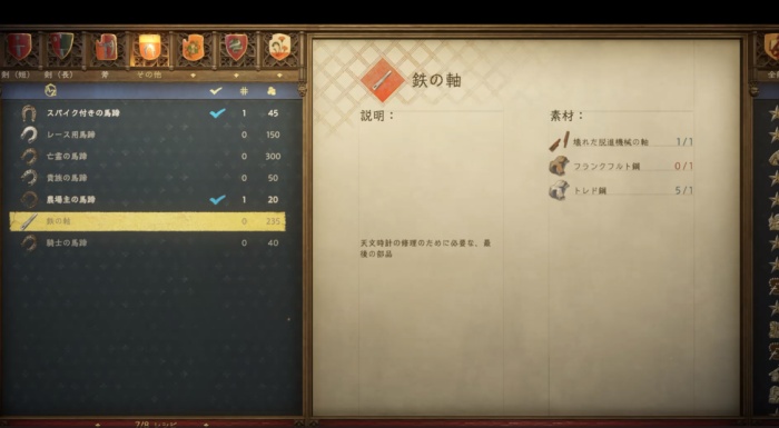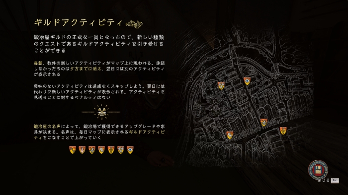 式典を行い、壁に「ギルドの剣を掲げる」と正式にクッテンバークの鍛冶屋ギルドに加入したことになる。トロフィー「鍛冶場ギルドの親方」取得。