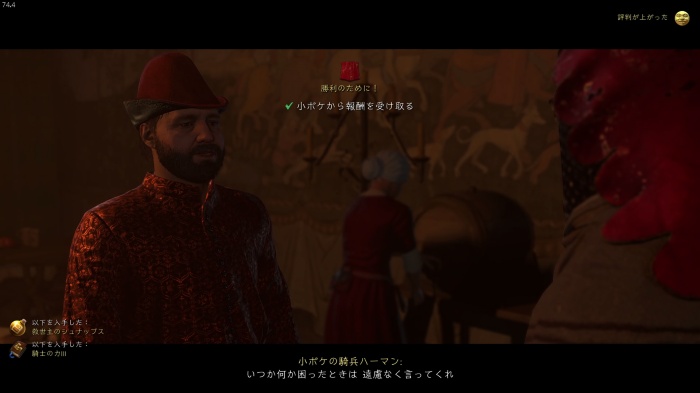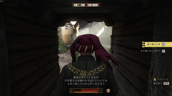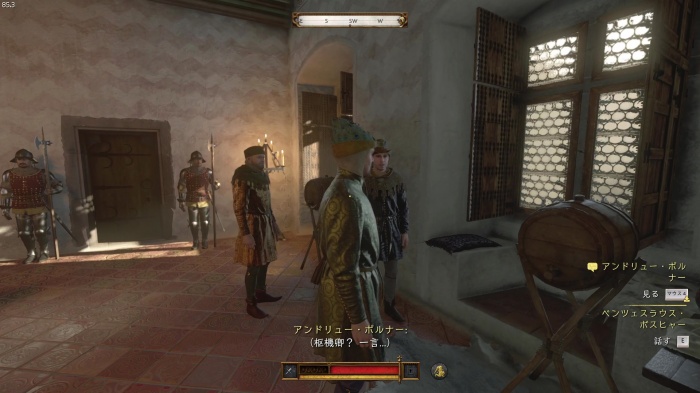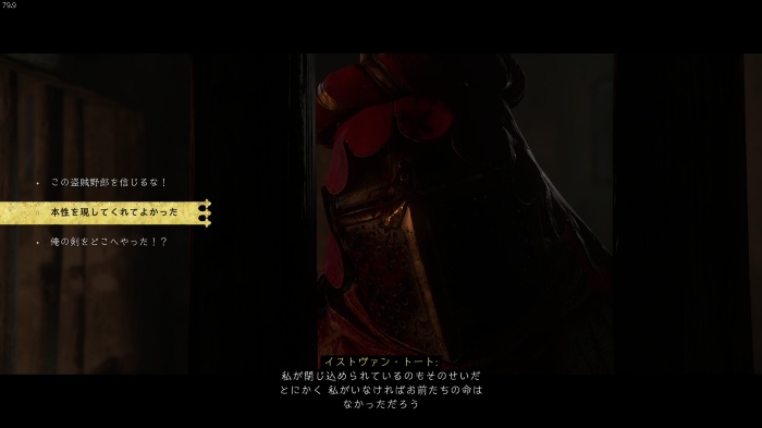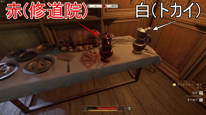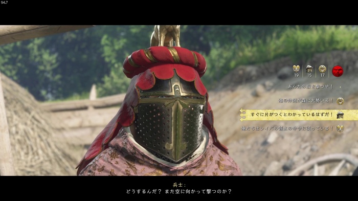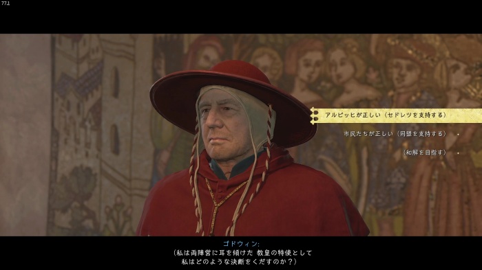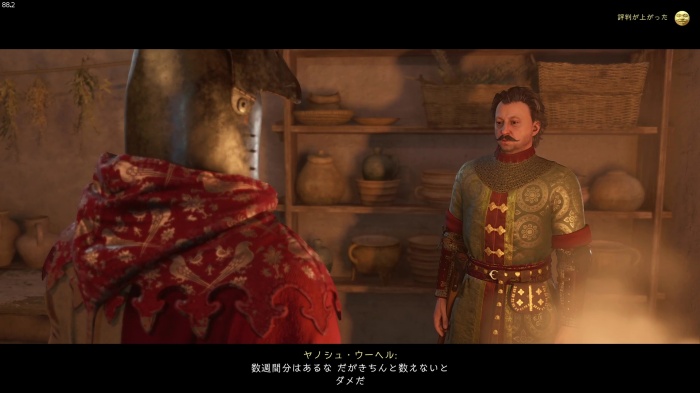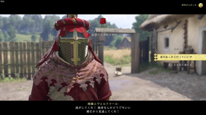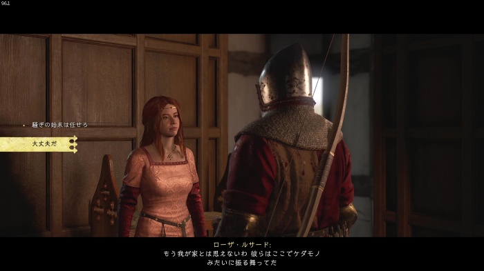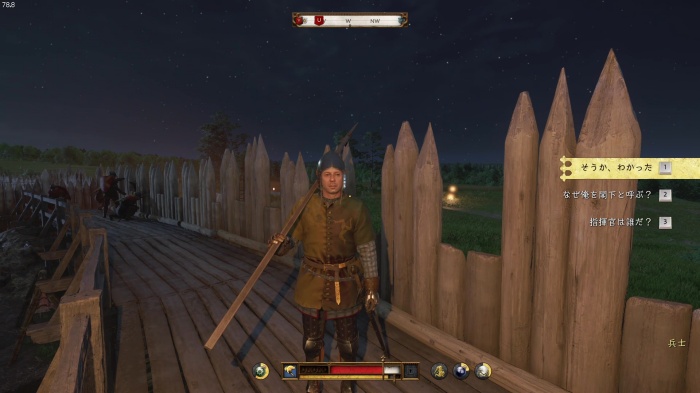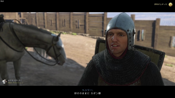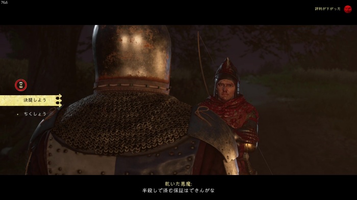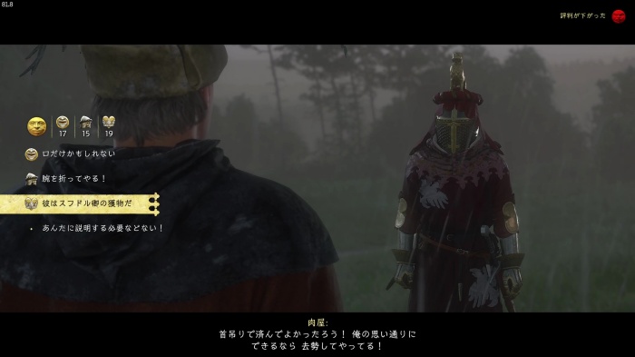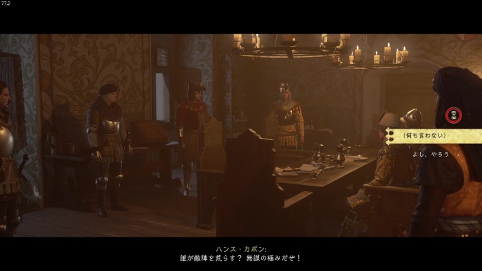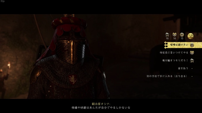 「お前がなぜ信じられるんだ?」というトーマス卿の質問に対する正解選択肢は1番目の「使者として同盟を結びに来た」。これを選ぶとトーマス卿の評判アップ。また2番目の「使者として同盟を結びにきた」も評判を上げることができます。