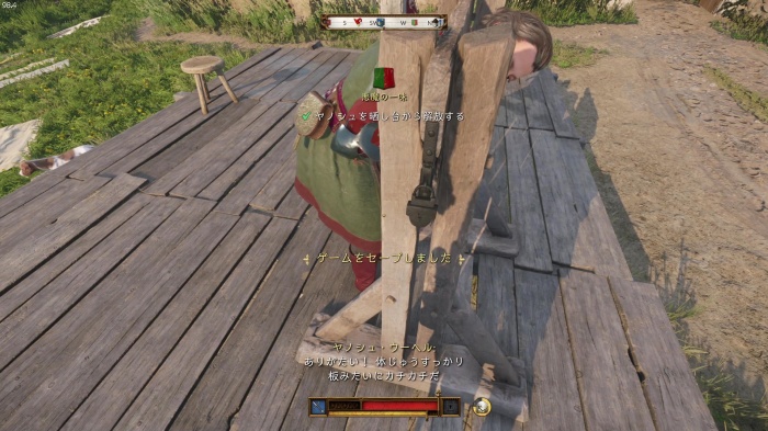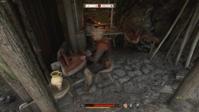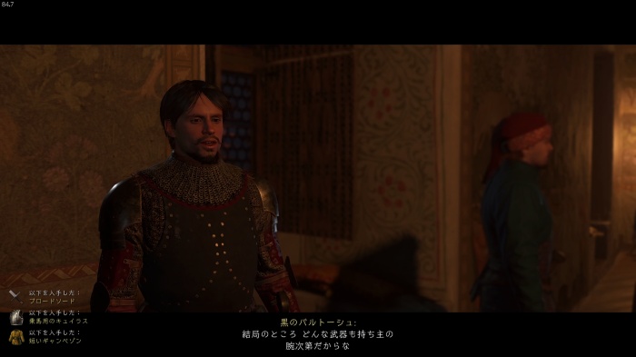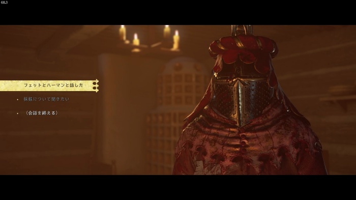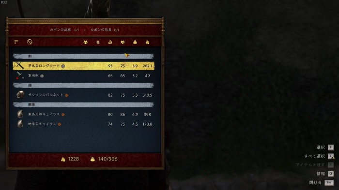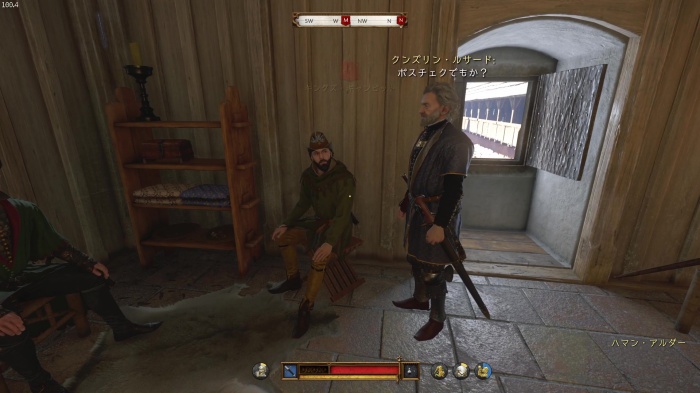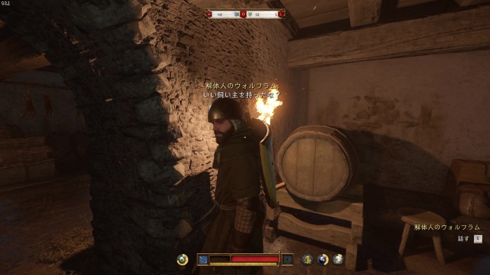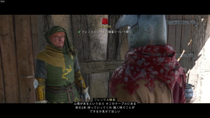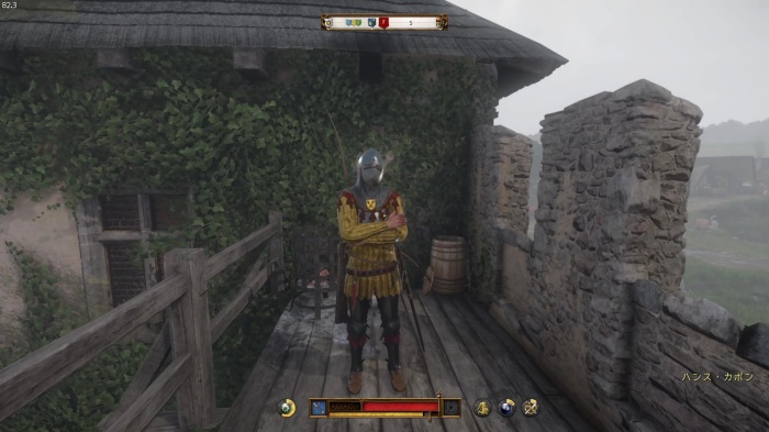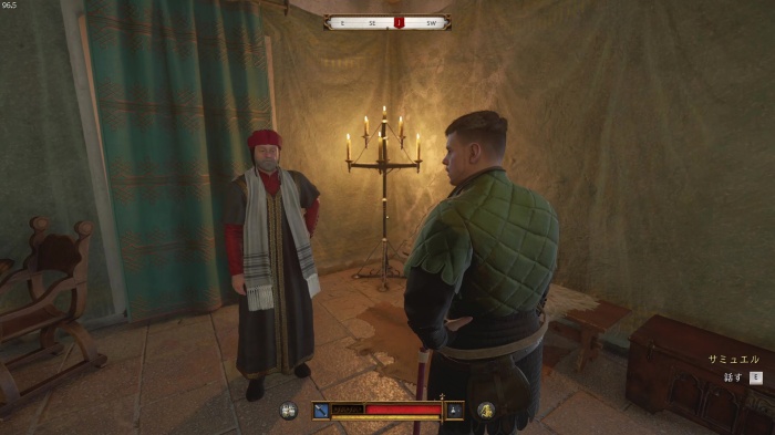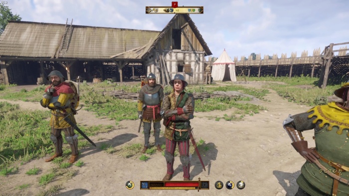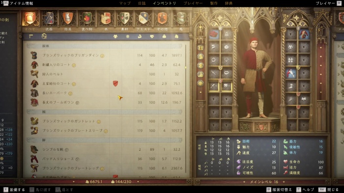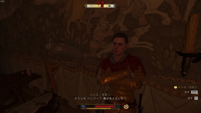 I / 十字キー↓でインベントリを開き、「訓練用ロングソード」と「パッド入りコイフ」、「複合型のケトルハット」を装備してハンス卿に話しかけましょう。
