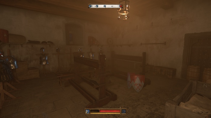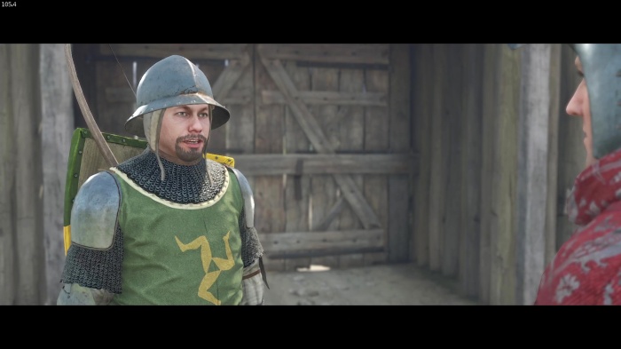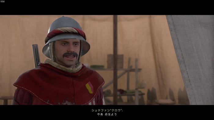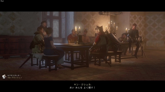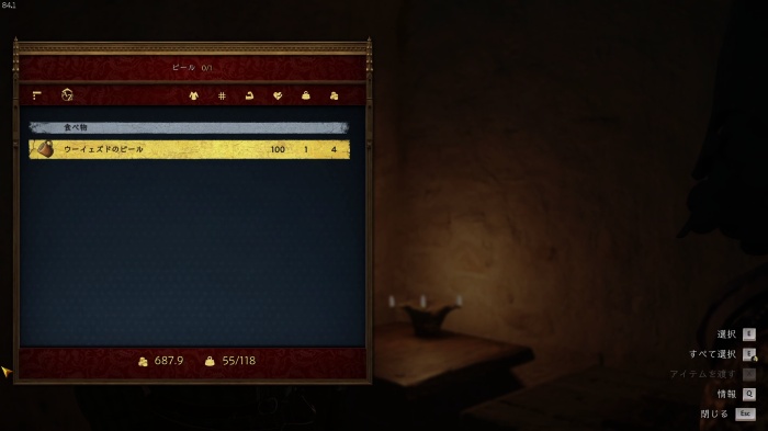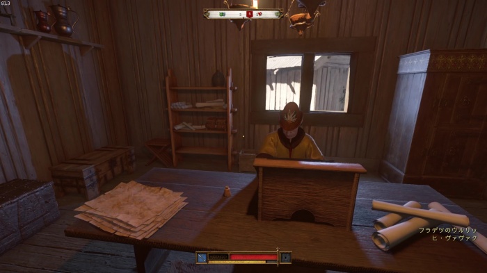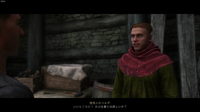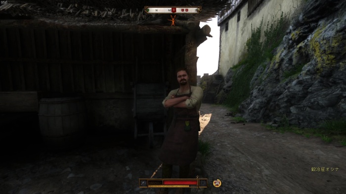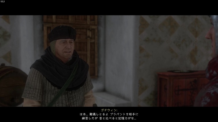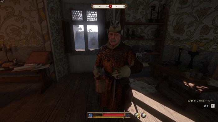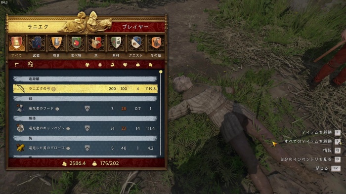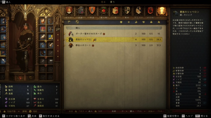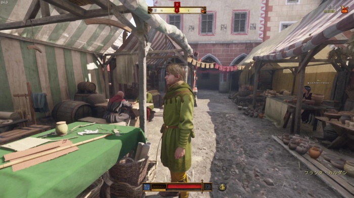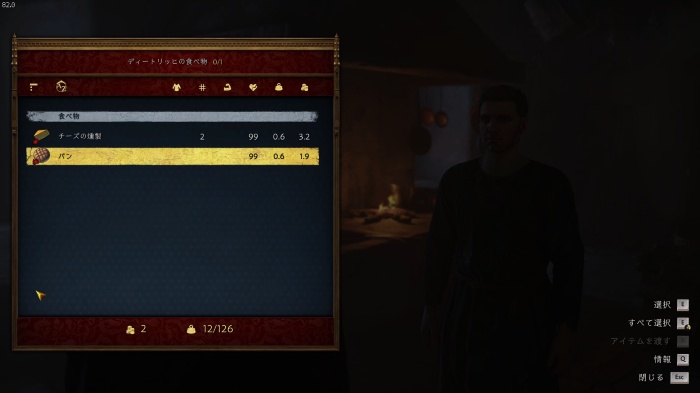 I / 十字キー↓でインベントリを開き、「訓練用ロングソード」と「パッド入りコイフ」、「複合型のケトルハット」を装備してハンス卿に話しかけましょう。