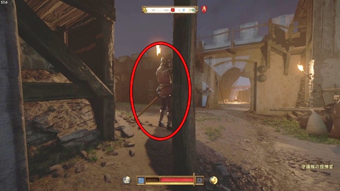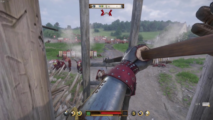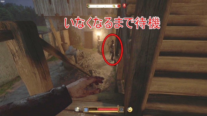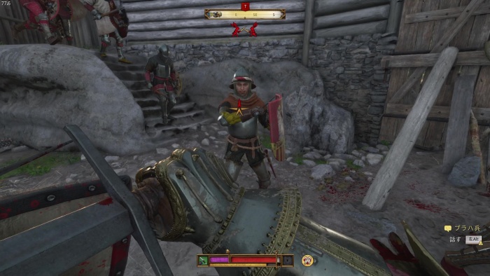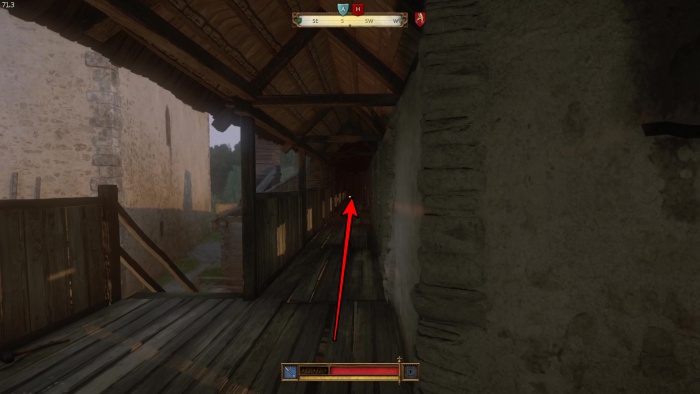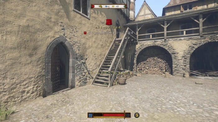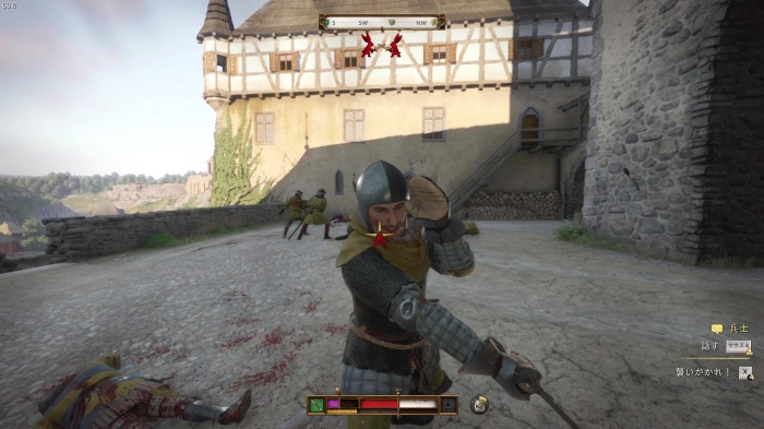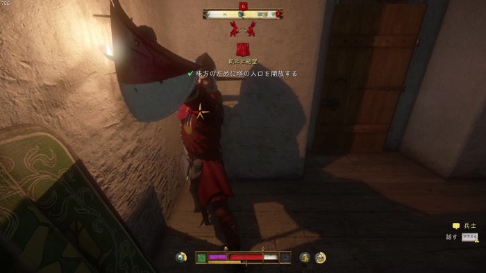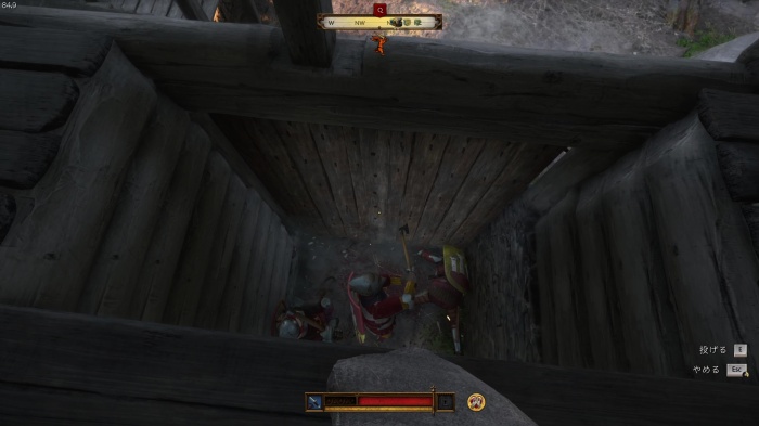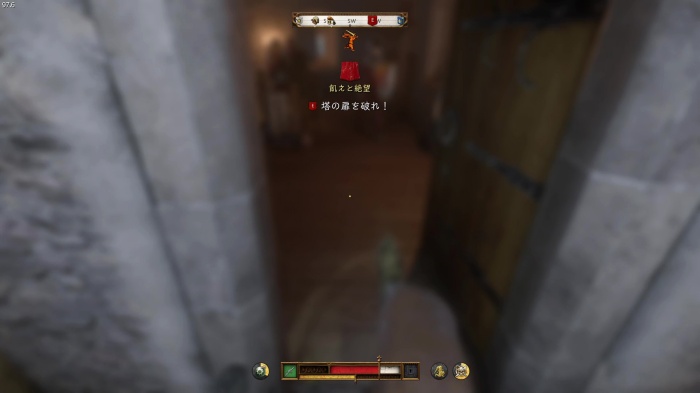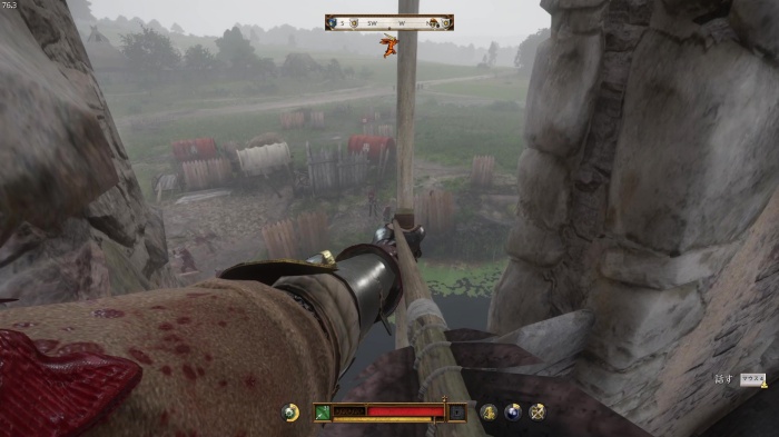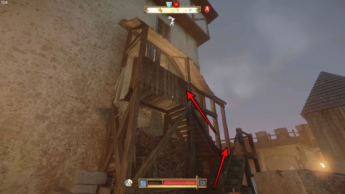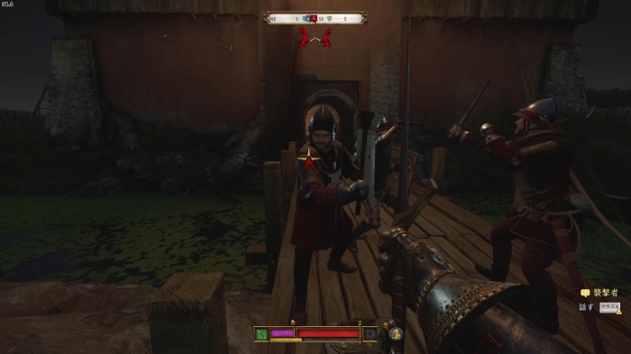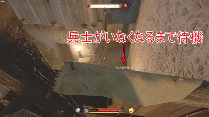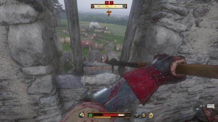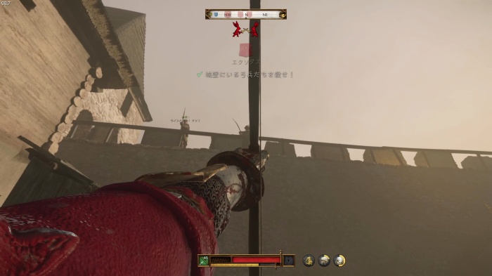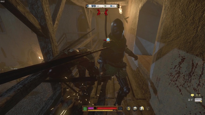 階段を降りて中庭の門の前にいる敵にクロスボウを撃ちましょう。