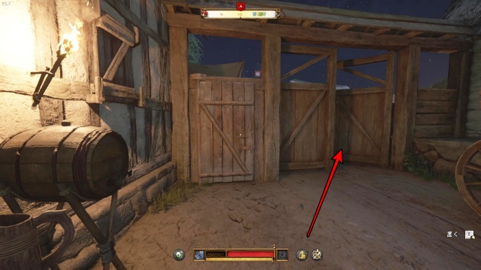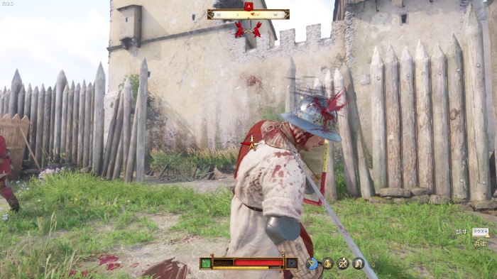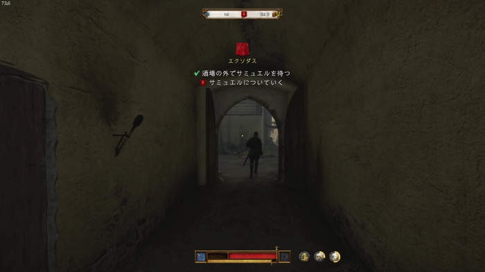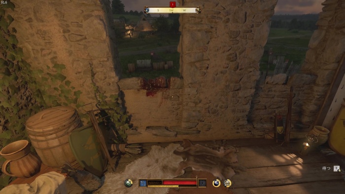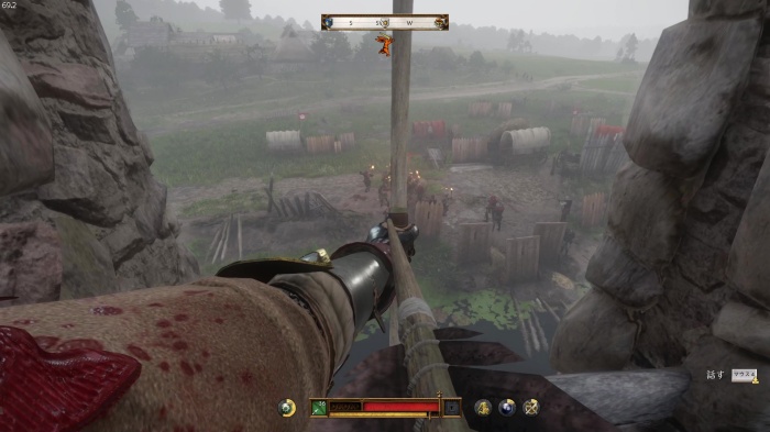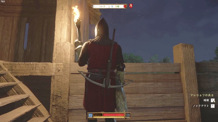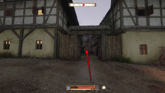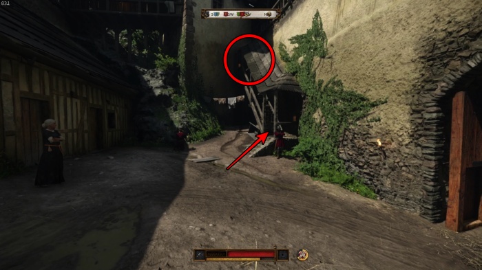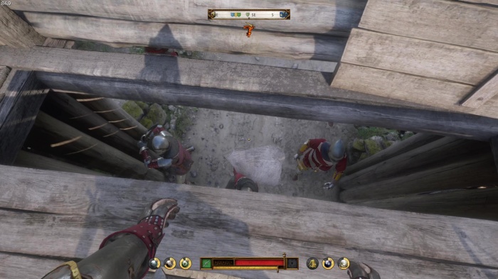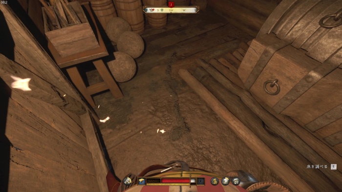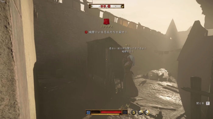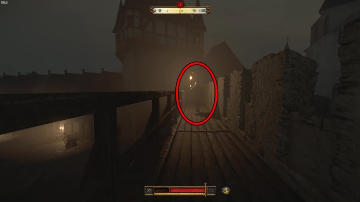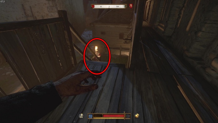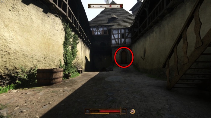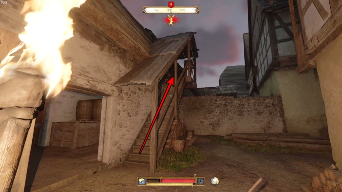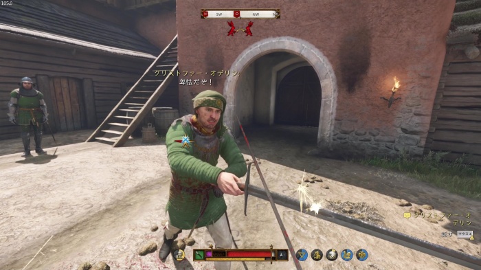 階段を降りて中庭の門の前にいる敵にクロスボウを撃ちましょう。