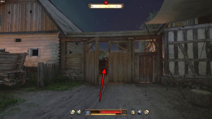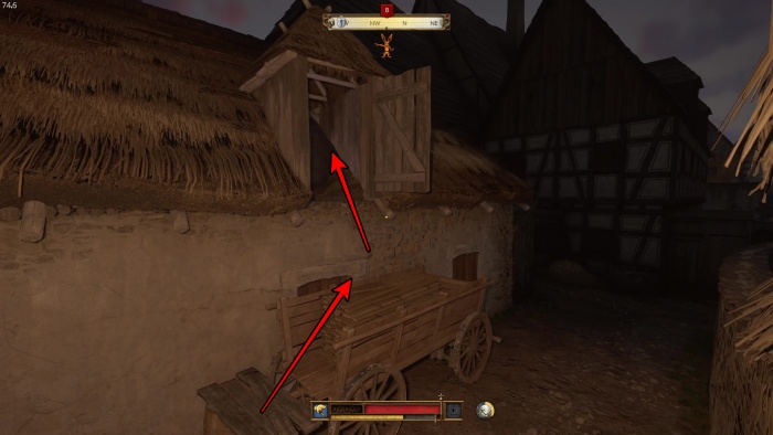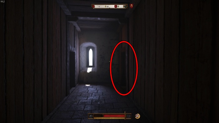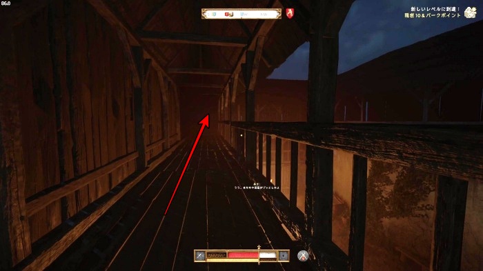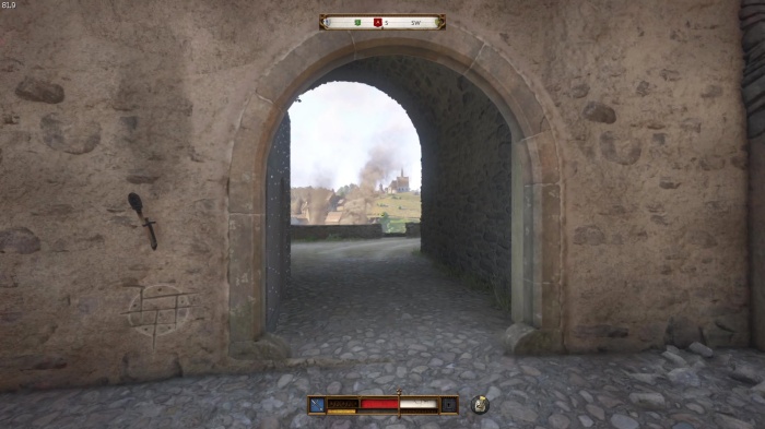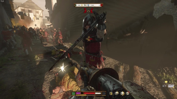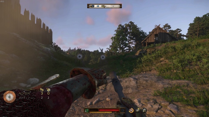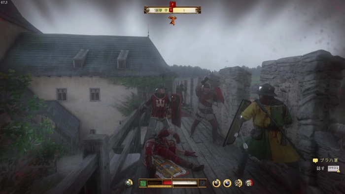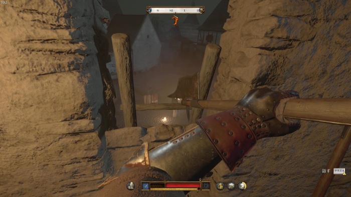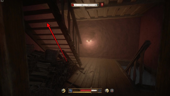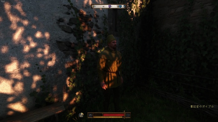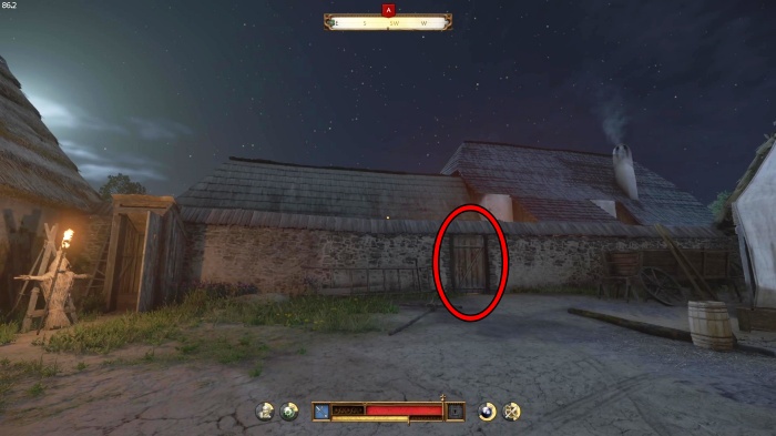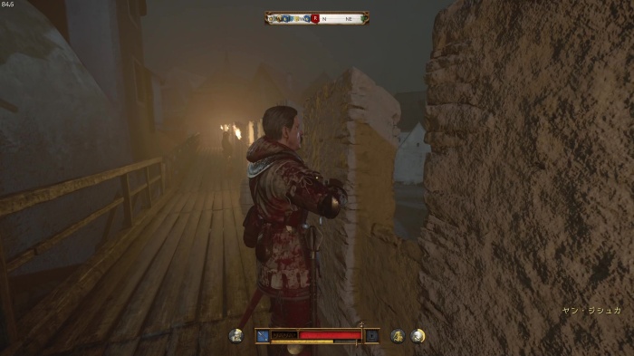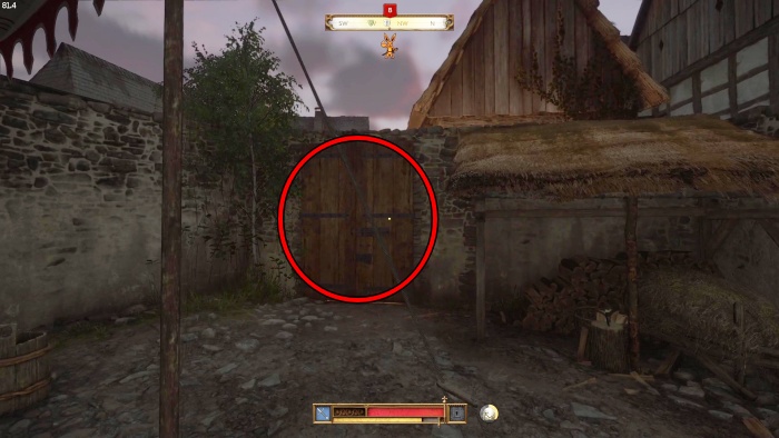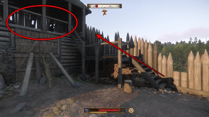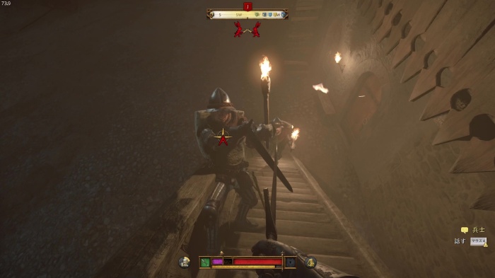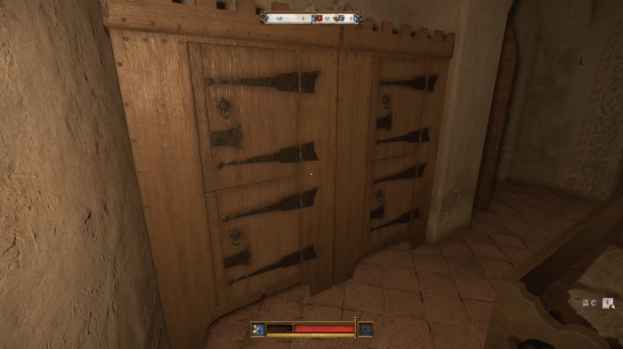 階段を降りて中庭の門の前にいる敵にクロスボウを撃ちましょう。