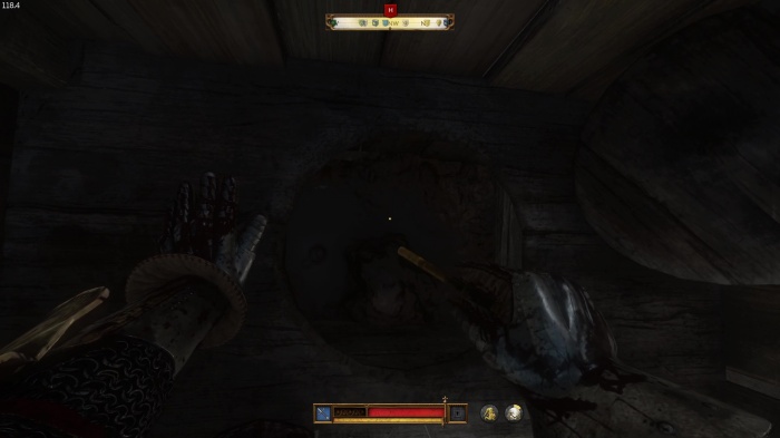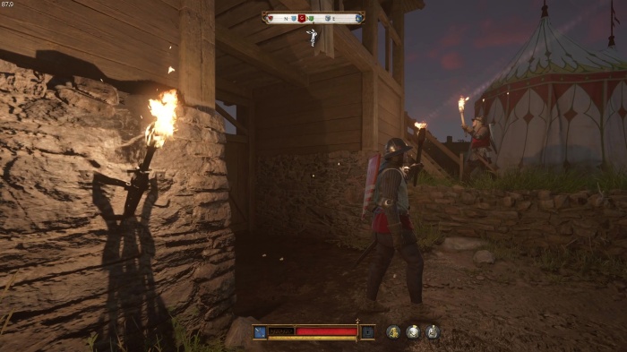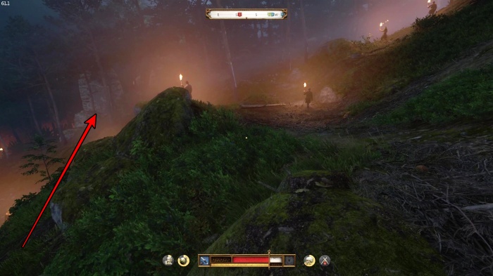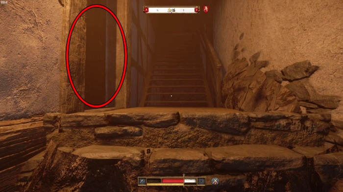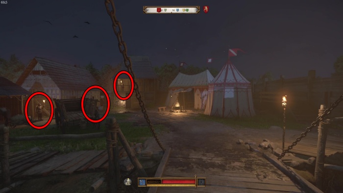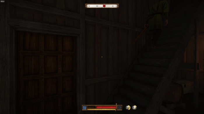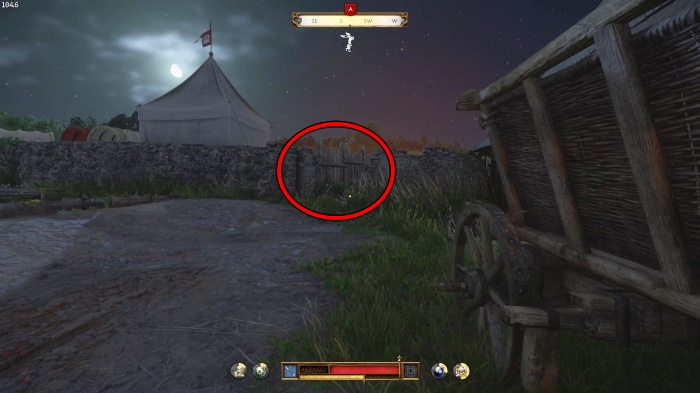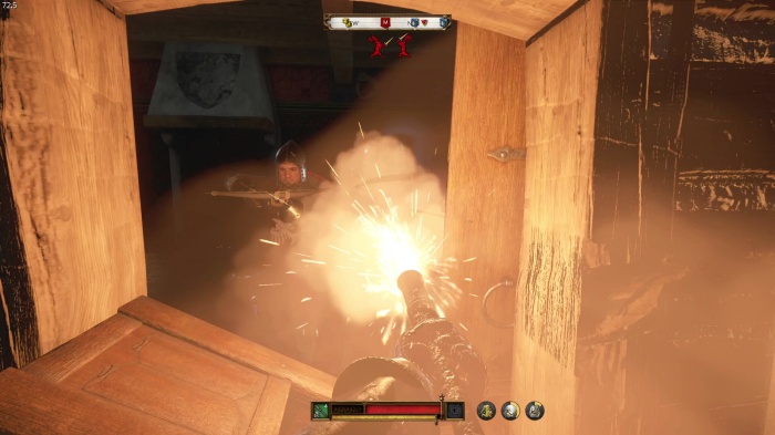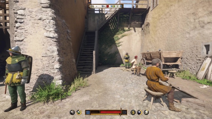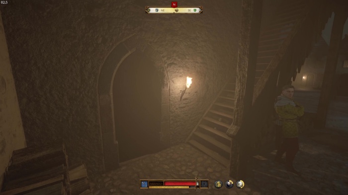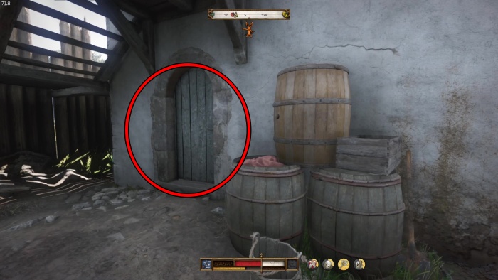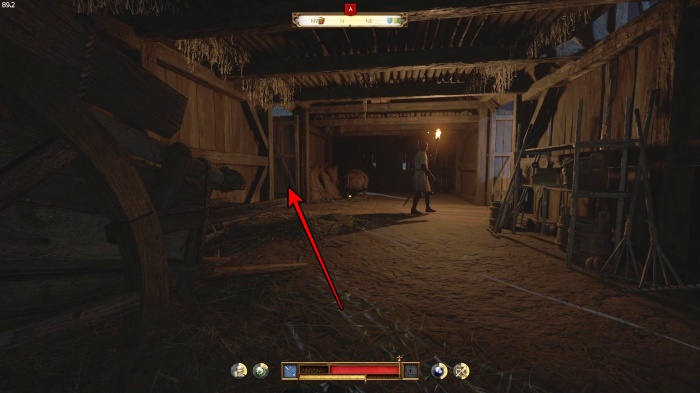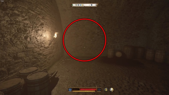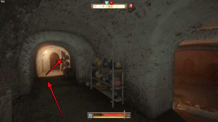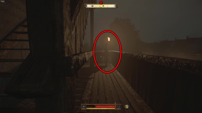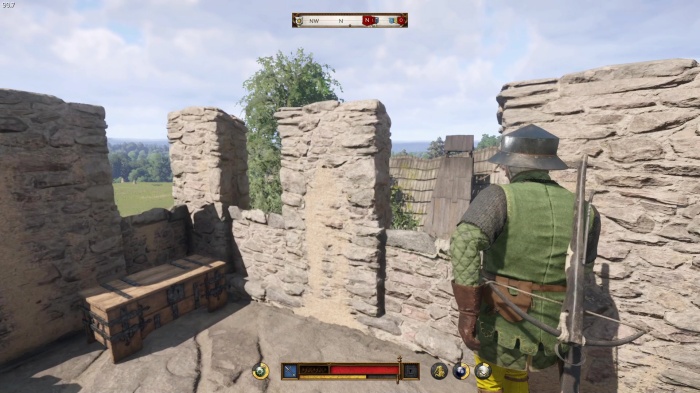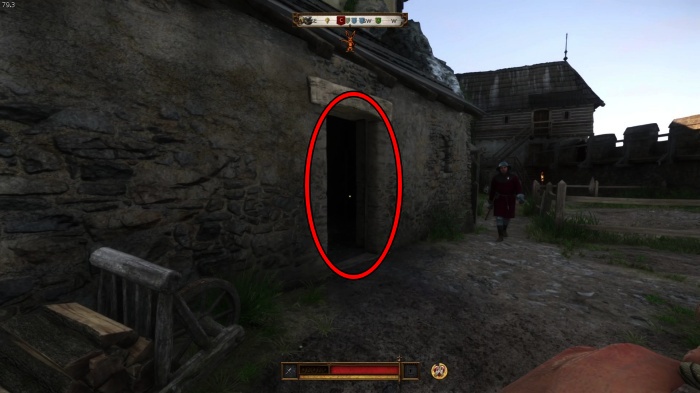 階段を降りて中庭の門の前にいる敵にクロスボウを撃ちましょう。
