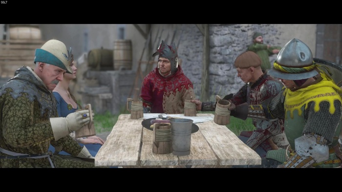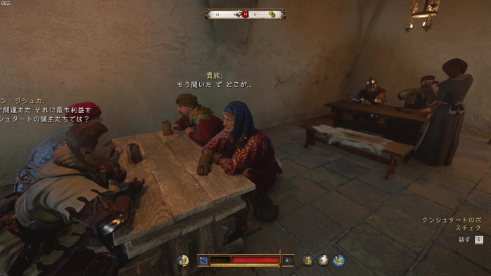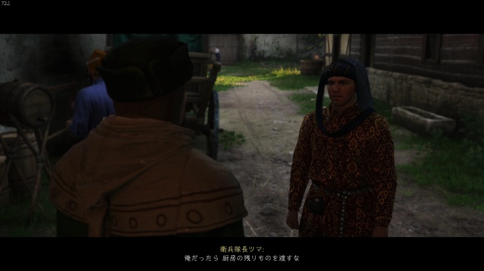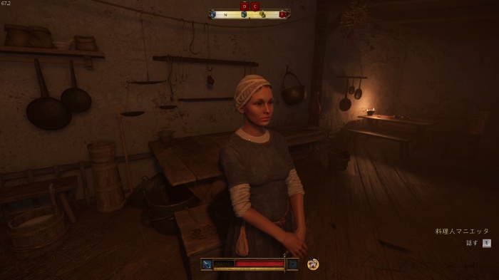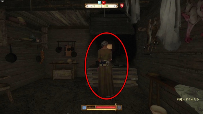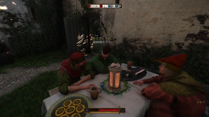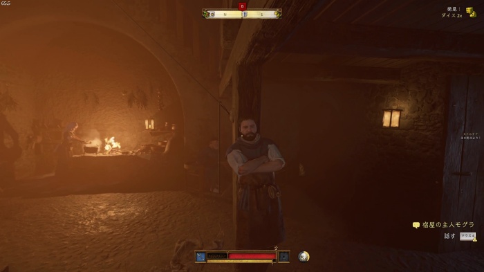 マットの餌を探すために鍋の前にいるオーツに話しかけましょう。説得の選択肢は2番目の「貴族の宴会の料理を持ってきてやる」が正解、オーツの評判アップし、餌のソーセージを貰えます。説得に失敗した場合はタンカードとダイスゲームをしに行きましょう。