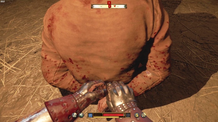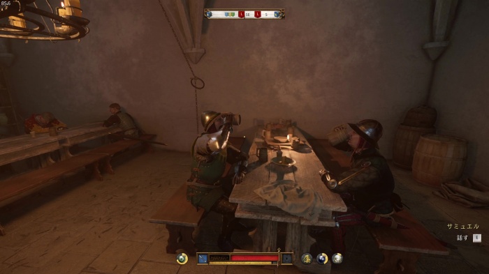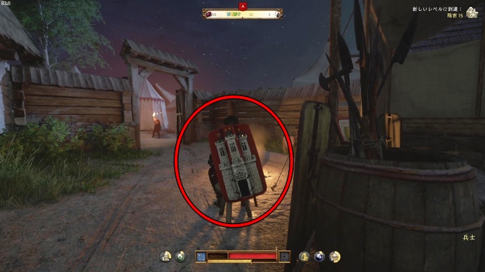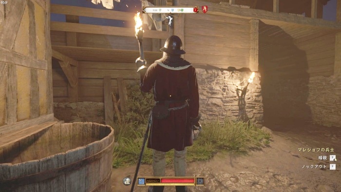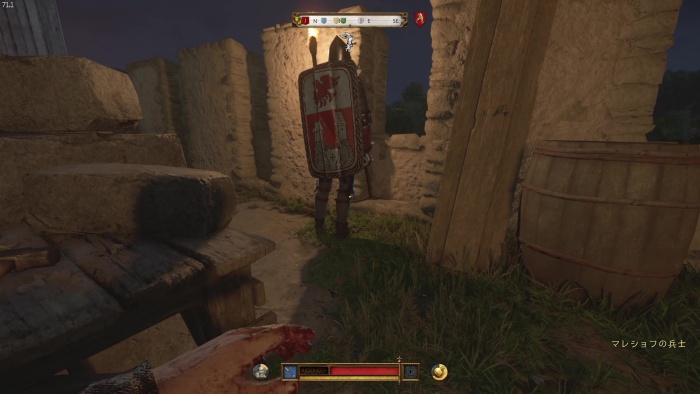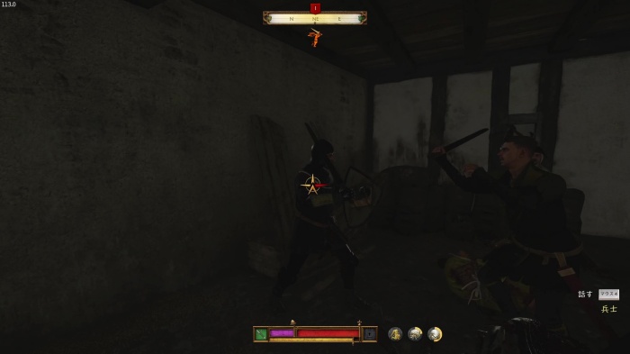 ハンスに勝つにはパーフェクトブロックでスタミナ管理すると良いです。パーフェクトブロック中はスタミナ消費しないので突き返しせず相手の攻撃をわざと受けてスタミナ回復しつつ、スタミナが万全ならパーフェクトブロックからの突き返しを繰り返してじわじわダメージを与えていきましょう。訓練用の剣での戦闘になるので倒すには2~5分ほどかかります。