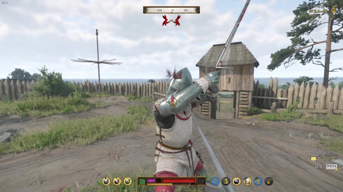 パーフェクトブロック成功後に中央に青い剣のマークが出現します。この時にすぐ左クリックを押すと「突き返し」で反撃ができます。