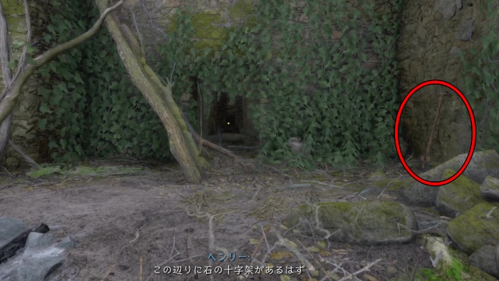 森の中を進むと廃墟があります。シャベルがこの後必要になるので、持っていない場合は右側の壁に立てかかっているシャベルを入手しましょう。