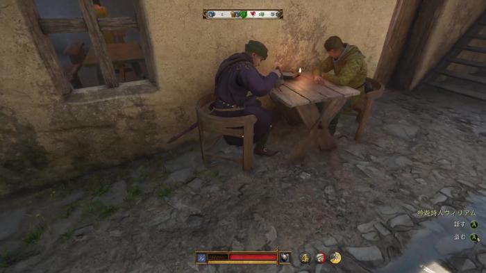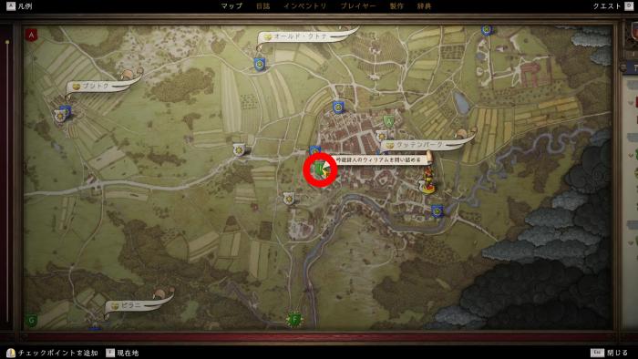 上記画像の場所にいる吟遊詩人のウィリアムと話しましょう。会話の選択肢は何でもいいですが、彼は犯人ではないので、殺人なんかしていないという主張は信じてあげると良いでしょう。