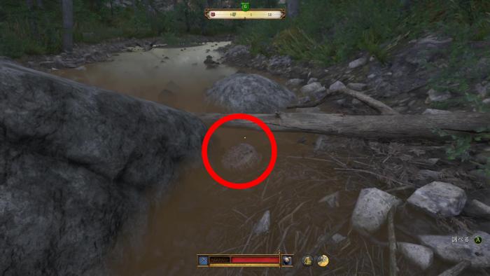上記画像の場所に行き、水辺に落ちている籠を調べます。