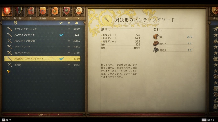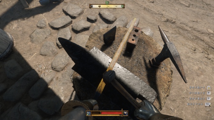 鍛冶場で対決用のハンディングソードを作成しよう。レシピと素材はクエスト受注時にすでに受け取り済み。対決に勝利するには(おそらく)金品質以上が必要になるので職人技レベルが低い場合は後回しにしても良いかもしれない。