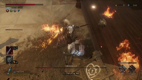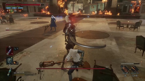 HPが50%以下になると鎌に炎属性を付与してきます。攻撃も激しいため、助霊にヘイトが向くまでは大人しくガードや回避に専念しましょう