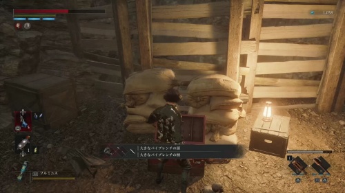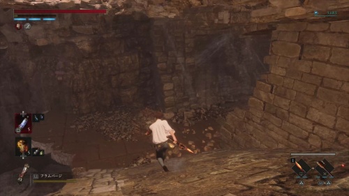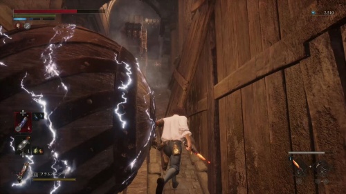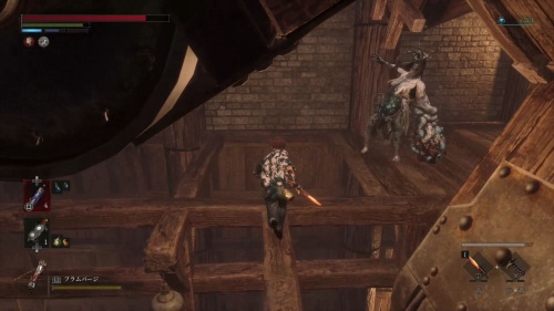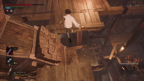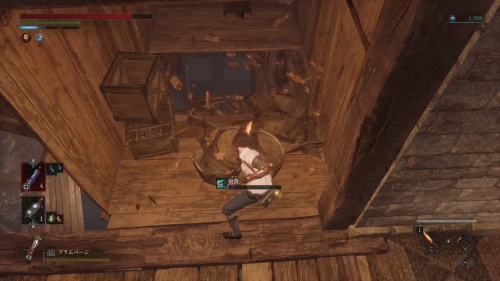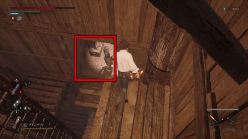 腐食水を渡ってハシゴを登りましょう。天井の梁を渡って奥にあるハシゴも登ります。登ったら近くのタルを破壊して下に降りるとアイテムを回収できます