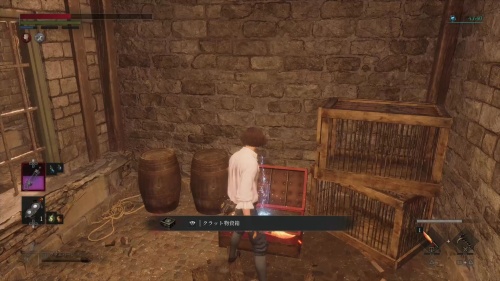 つり橋の先に進んだら正面の建物に入りましょう。柵が上り閉じ込められるので出現する人形を全て倒します。倒したら左側にある宝箱から「工房組合 標準耐食変換器」を入手し、奥にあるレバーを引いて外に出ましょう