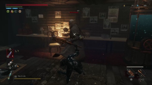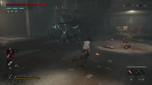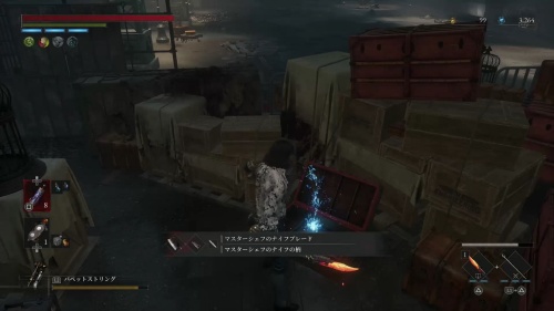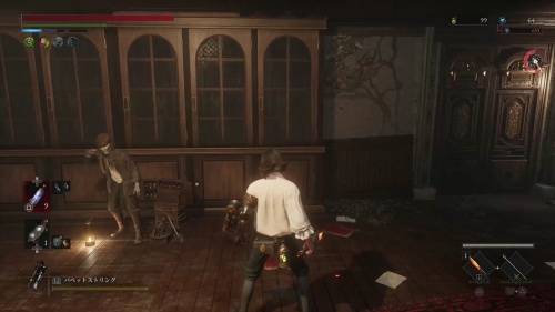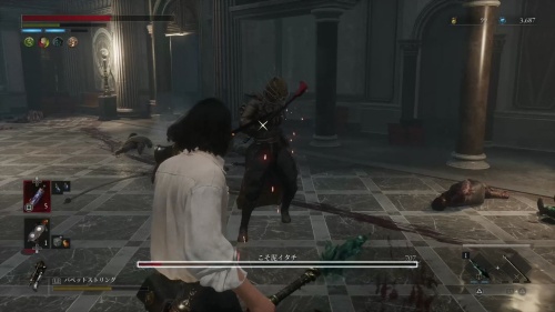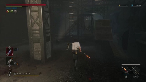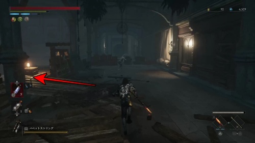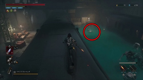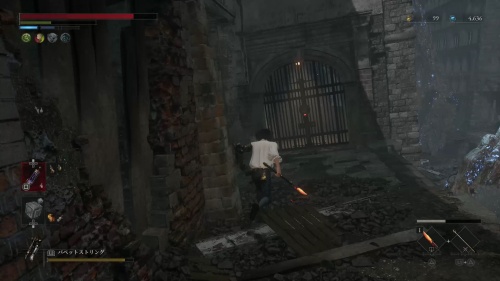 ショートカットの扉の先には腐食エリアにいたのと同じ中ボスがいます。中ボスの後ろにあるハシゴを降りて広場に向かうと獣型の中ボスが出現します。倒すと「殺人操り人形のアミュレット」を落とします