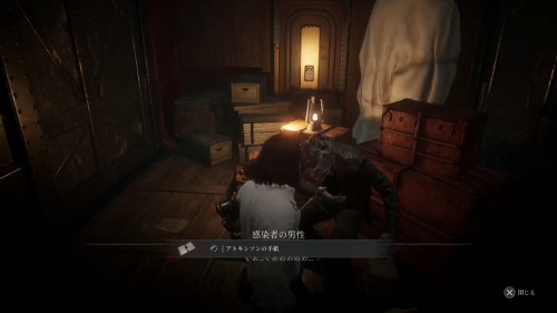 階段を降りて後方にある車両にカーカス化してるNPCがいます。話しかけると「アトキンソンの手紙」を入手できるので、ホテルにいるベルに渡しましょう