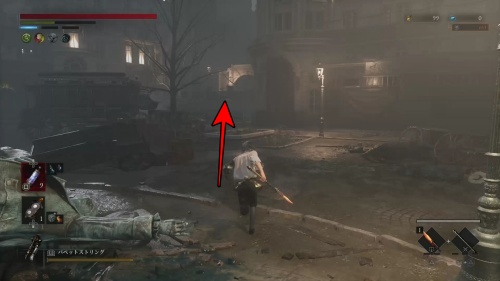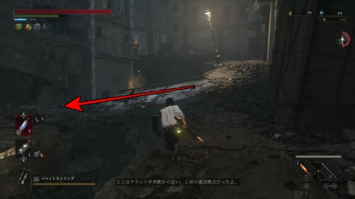 外に出たら看板を渡って先に進みましょう。看板を渡らず右側に行くとアイテムが落ちています