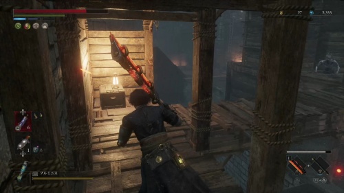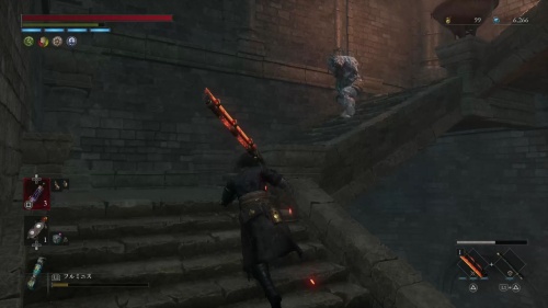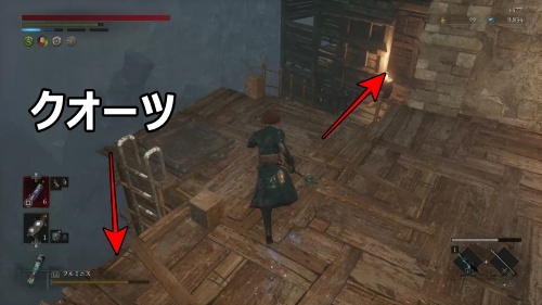 杖持ちなどの敵がいるエリアのハシゴを上がり建物に入りましょう。階段を降りるとハシゴのショートカットがあります