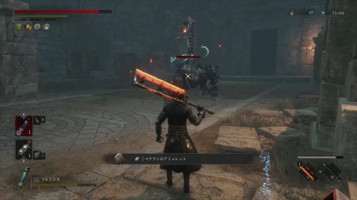 先に進むと橋に獣型の中ボスが2体います。中間に宝箱があり「ベテランのアミュレット」が入っています。1匹ずつ誘き出して倒しましょう