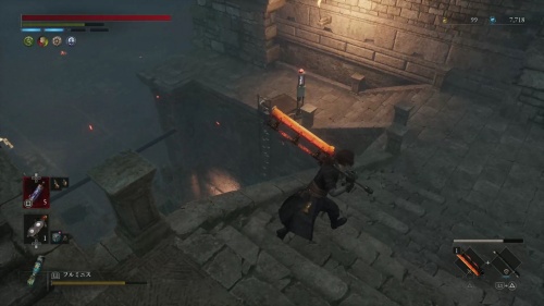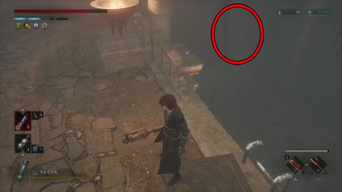 外に出たら左奥に2つアイテムが見えます。足場を使って安全に飛び移りましょう。「特殊耐性のアンプル剤」と「完全な盟約の月長石」があります