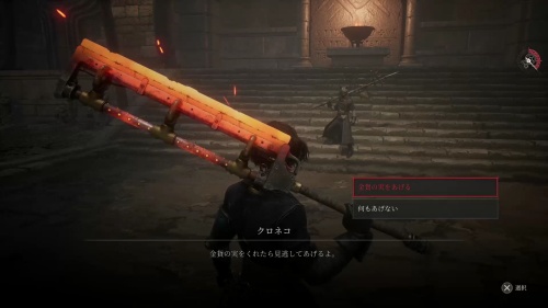 広いボスエリアの所にクロネコがいます。話しかけて「金貨の実をあげる」を選択すると戦闘を回避でき、「クロネコのマスク」がもらえます