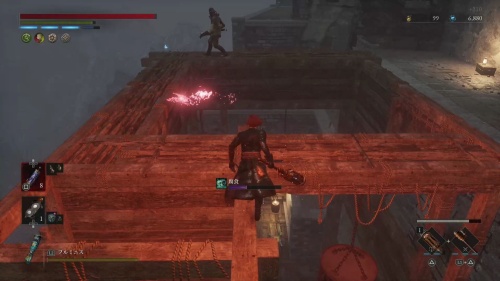 木の橋を渡って左側に進むとショートカットのハシゴがあります。下ろしたら橋を渡って右の方に進みましょう