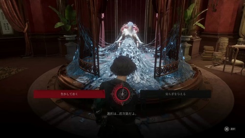 扉を開けるとソフィアを「生かしておく」or「安らぎを与えるか」の選択をしなければいけません。安らぎを与えると椅子にあるレコード「Shadow Flower」が拾えます
