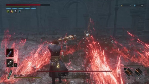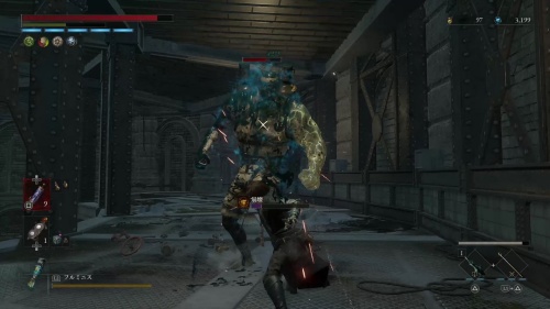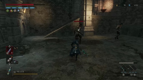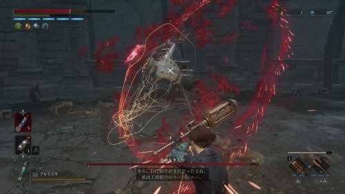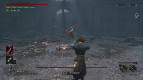 シモン・マヌスは右手の武器を振り回して攻撃してきます。回避が簡単なのでジャスガを狙うより回避してから反撃を狙う方が戦いやすいです