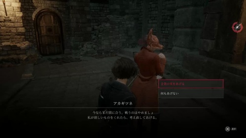 エレベーターに乗ってきた道を戻ってきたらもう一つの道に進みます。アカギツネと会話し、「金貨の実をあげる」を選択するとアカギツネとの戦闘を回避でき、「アカギツネのマスク」が入手できます