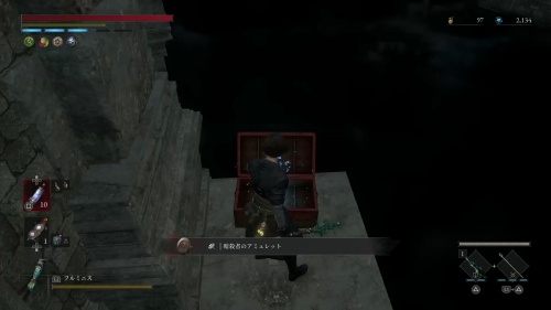 スターゲイザーから左に進み崩れた足場の先に宝箱があります。ジャンプで宝箱の元に着地しましょう。中には「暗殺者のアミュレット」が入っています