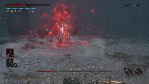 武器に雷を付与して叩きつける攻撃は叩きつけ後、遅れて周囲に雷爆破が発生します。叩きつけを前に回避するか、ジャスガした場合は雷爆破に合わせて回避して避けましょう
