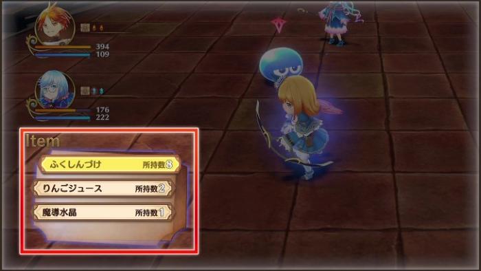 戦闘中、フィアだけがアイテムを使用することができ、「アイテム」コマンドでバトル中に使用可能なアイテムを表示することができます。