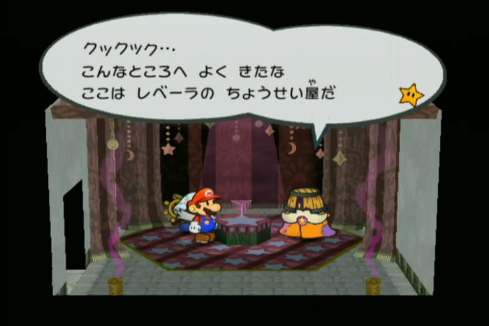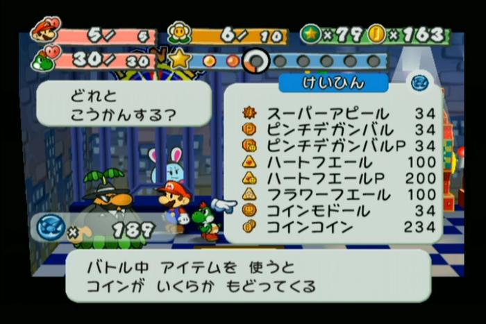 レベーラのちょうせい屋では、マリオのレベルアップ時に選んだHP、FP、BPを39コインで調整することができます。