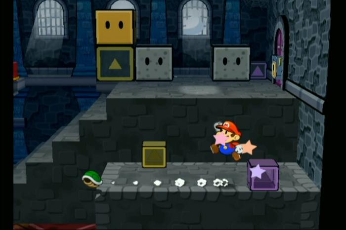 - 紫ブロックに乗り、灰色ブロックを渡って黄色ブロックをハンマーで壊す