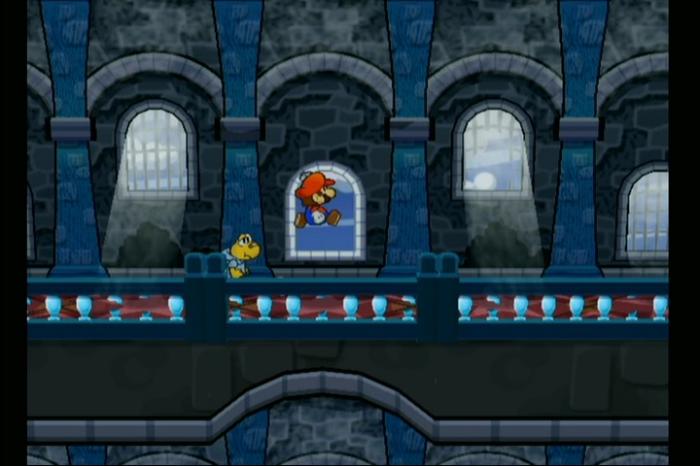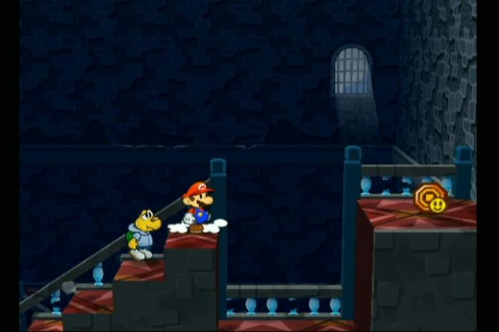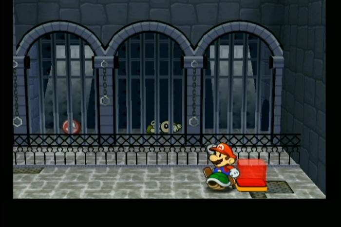 - 細い足場を進み、ペーパーモードで鉄格子をすり抜ける