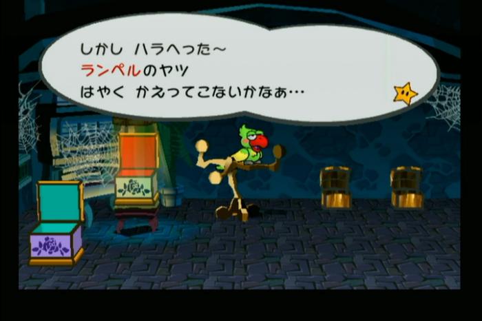 オウムの前でビビアンで隠れると、オウムが話し出し、にせマリオの本当の名前が「ランペル」だと知ることができます。