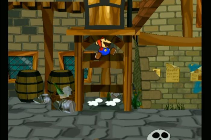 ゴロツキタウンの広場のセーブブロックの横でジャバラジャンプをすると宝箱を落とすことができ、「ウルトラハンマー」を入手することができます。
