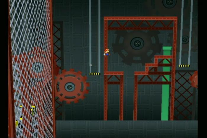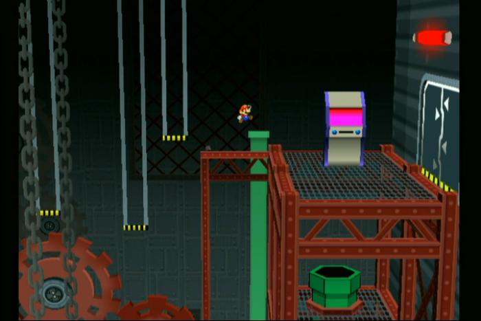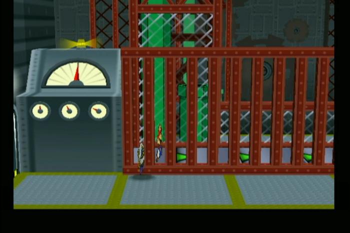ゴロツキタウンの地下の地下街の上下する足場の後ろでジャバラジャンプをして鉄パイプを伝った先