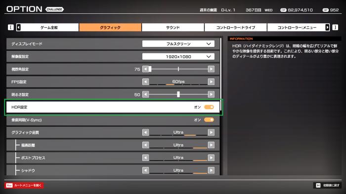 オプション画面よりHDR設定を有効にすることで、HDR出力に切り替えられます。