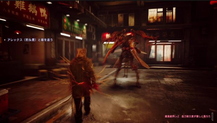アレックスが屋上に向かうムービーを発生させた後、大通りに戻って画像の「肥龍麵家」の看板の上にブラッドジャンプで行く