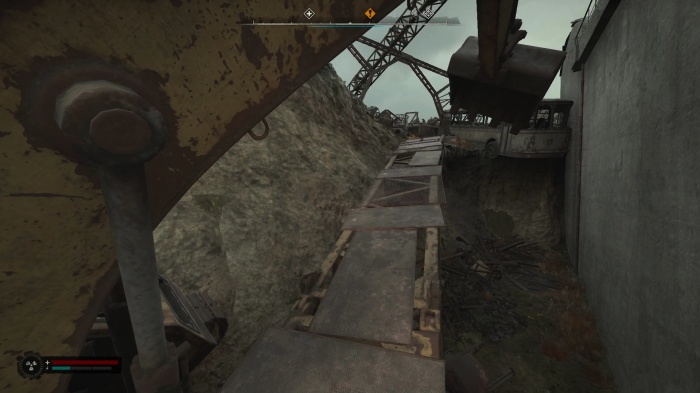 コンパスに表示されている目標地点に進みます。外に出て階段を上がって山の上に登ります。洞窟を抜けて壊れたクレーンの上にいるリヒターと話します。
