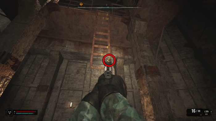 ハシゴに錠がかかっているのでこれを撃ってハシゴを下ろします。