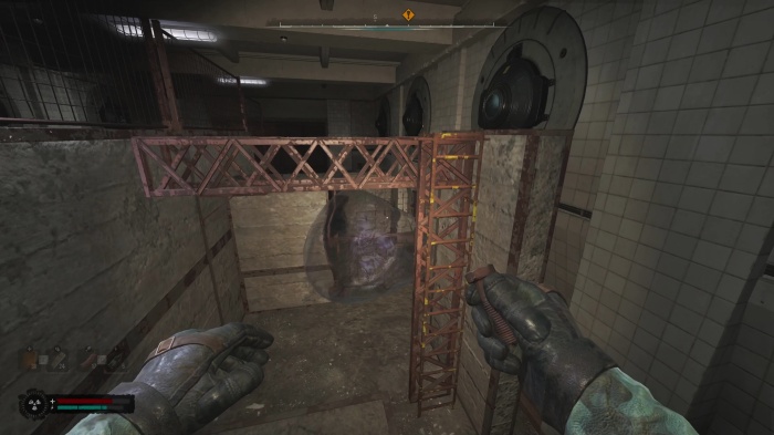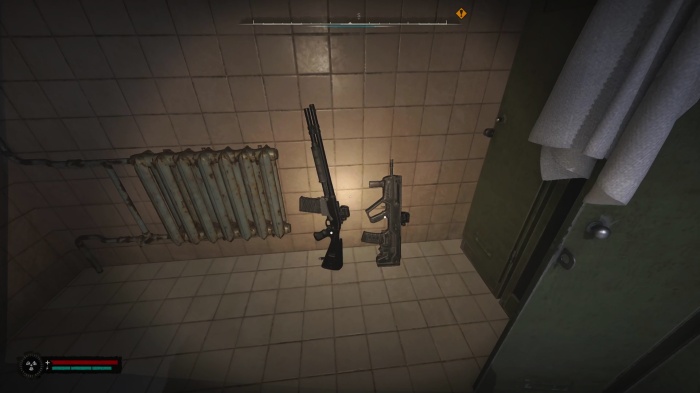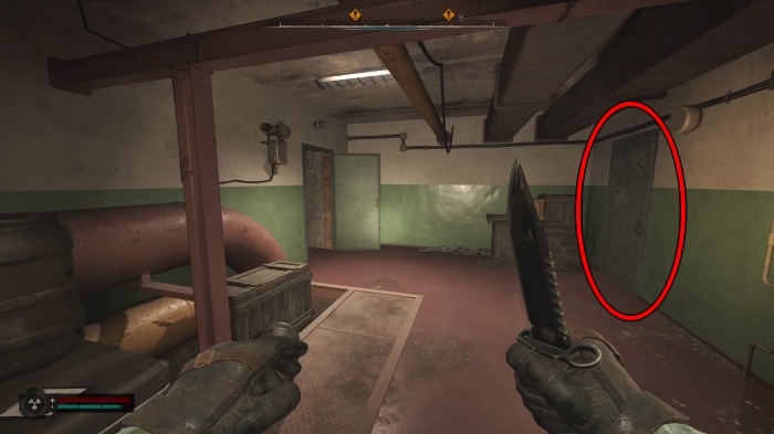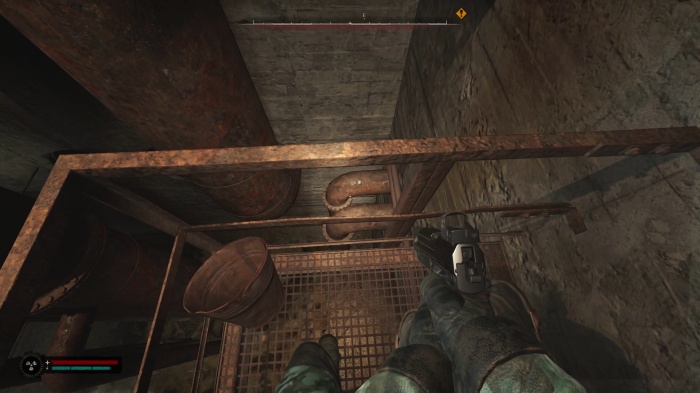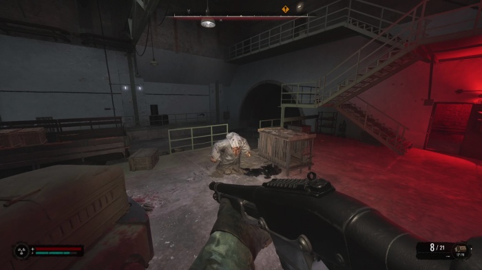 通路の手前にある非常階段から上に上ります。上がって右奥に倉庫があります。上がってすぐ左にゾンビ兵士がいるので注意しましょう。