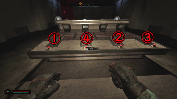 ボタンが4つあるエリアは左から右に並んでいるボタンを1番目→3番目→4番目→2番目の順に押すと扉が開きます。