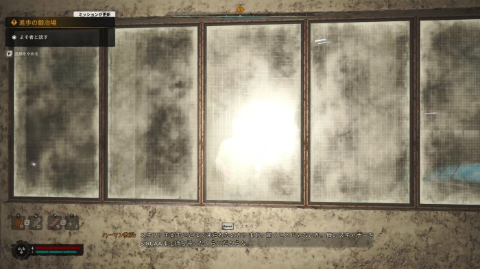 画面上部のコンパスを頼りに外に出てラボに向かいます。