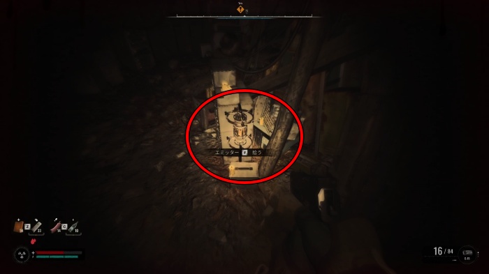部屋の中が円状になっている場所に「エミッター」が落ちています。