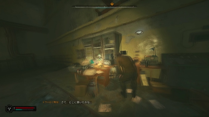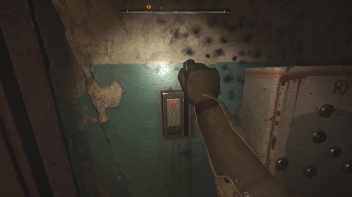 ドヴパロフに会いに行き電子首輪を渡しましょう。部屋に入るには入り口のスイッチを押す必要があります。